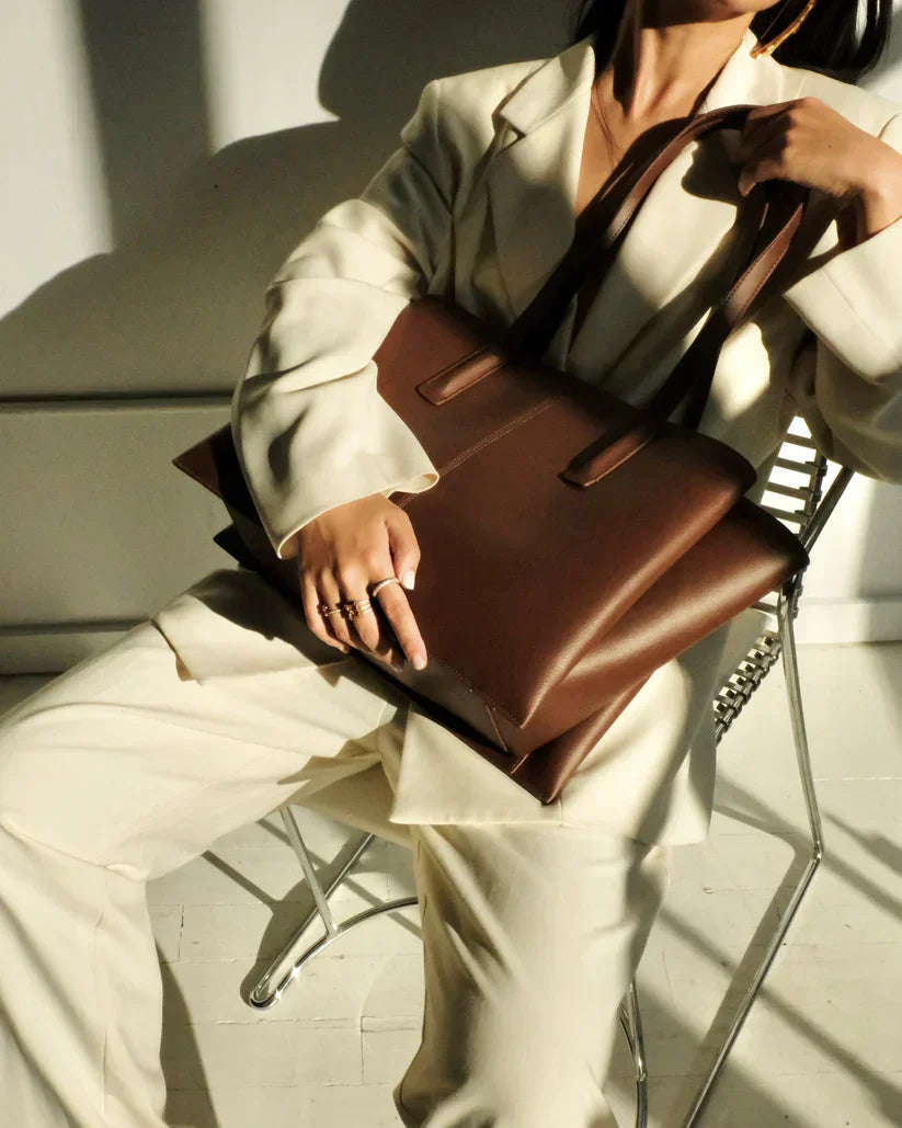 Sleek and structured, the Eugene Tote in Espresso is a bestseller for all the right reasons. Ideal for work, its zipped middle compartment accommodates laptops up to 16" (measured diagonally), while two side compartments fit up to 13" laptops or important documents. Designed for organization, it features multiple interior pockets, comfortable 2cm-wide straps that won't strain your shoulder, and a shortened zipper track for easy access to your water bottle. This tote exudes professionalism, empowering you to walk into every room with confidence. Handcrafted from premium vegan ultrafiber and lined with tan microsuede