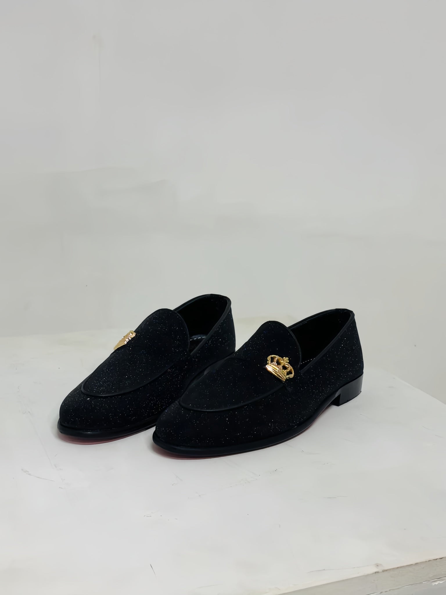 Step into elegance with these Regal Black Glitter Loafers. Featuring a sleek design with a shimmering black finish and adorned with a striking gold crown emblem, these loafers are the perfect choice for formal events, weddings, or upscale parties. Crafted for both style and comfort, they offer a luxurious touch to any outfit. Elevate your fashion game with these standout shoes that blend sophistication and glamour effortlessly.